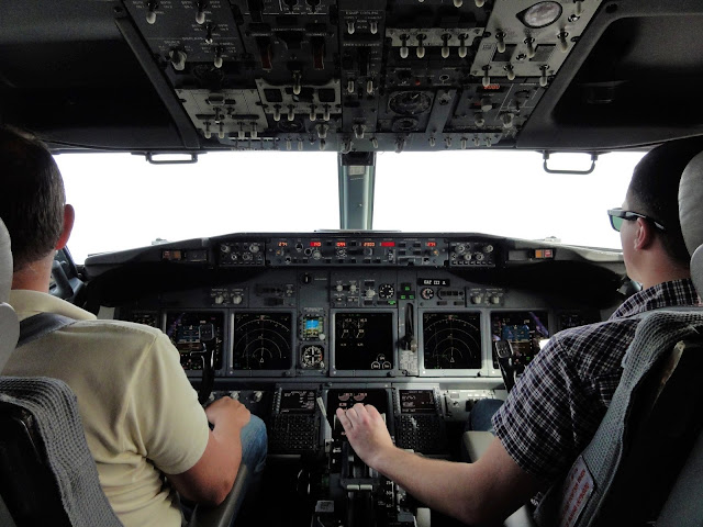 Poranek zaczęliśmy od skompletowania kilku dokumentów, odbioru tymczasowych identyfikatorów i krótkiej odprawy, po której podjechaliśmy pod nasz samolot: Boeing 737-700. Jest to nieco mniejszy wariant, niż „typowa” osiemsetka, ze słabszymi silnikami, ale i większym prześwitem pod ogonem przy starcie i lądowaniu, co zmniejsza ryzyko tailstrike’a. Poza niewielkimi różnicami w kokpicie (inny panel sterowania klimatyzacją) wersja -700 jest bardzo podobna do -800, z resztą wszystkie 737 są do sobie dość podobne, a niektóre przełączniki pamiętają jeszcze czasy 707…