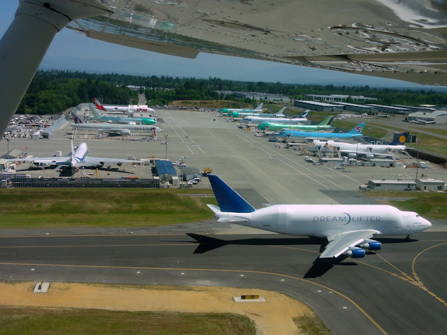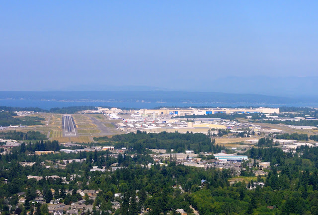 Kilkanaście minut lotu i zbliżamy się do Paine Field (PAE), czyli głównej fabryki Boeinga. Trudno przeoczyć potężne błękitne drzwi hangarów.